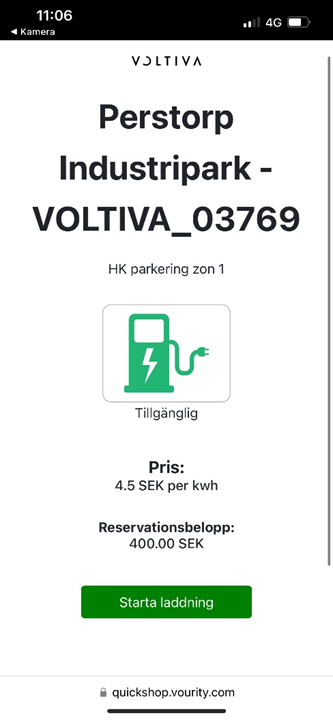 Man scannar den högra QR-koden för att sedan komma till Voltivas betalningssystem. Det står ”Scanna för att starta” ovanför QR-koden. Man får sedan upp laddstationen. Man kan kontrollera att numret är korrekt som ni ser på laddstolpen vid den lilla QR-koden.